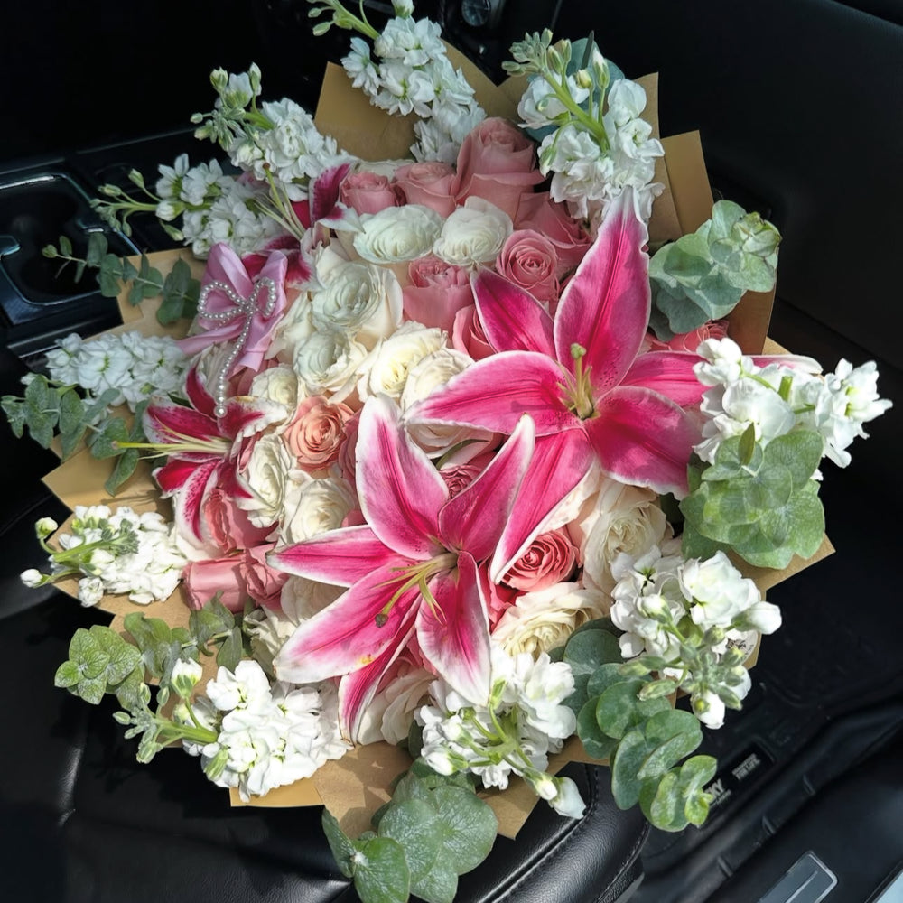 A breathtaking arrangement designed to impress with timeless beauty and elegance. Featuring vibrant pink lilies as the focal point, surrounded by a lush blend of creamy white and blush roses, accented with fragrant stock flowers and soft eucalyptus greenery, all carefully wrapped in rustic kraft paper.