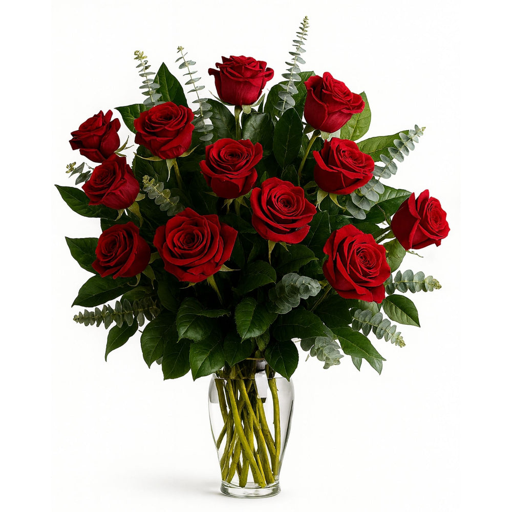A striking bouquet of two dozen long-stemmed red roses accented with fresh greenery. Perfect for expressing deep love and admiration.