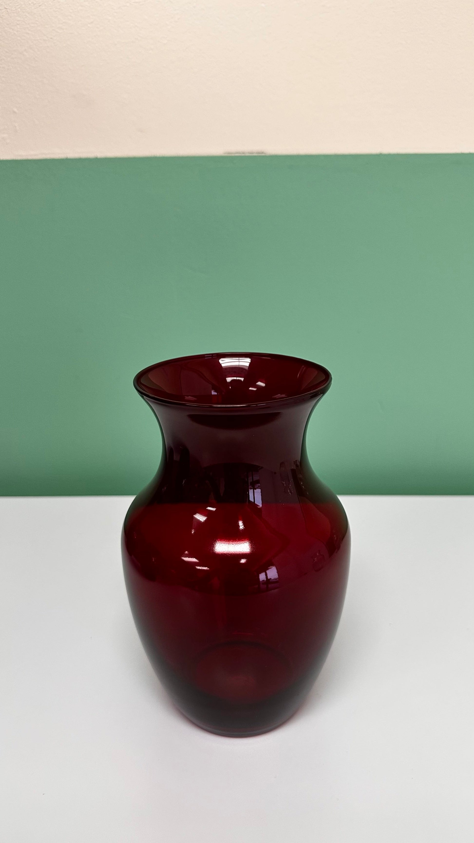 A rich ruby-red glass vase with a softly flared silhouette that adds depth, warmth, and drama to floral arrangements. The translucent finish allows light to pass through beautifully, enhancing bold blooms and creating a luxurious presentation.
