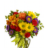 A colorful bouquet of bright yellow, purple, red, and orange blooms accented with fresh greenery. Perfect for lifting spirits and adding charm to any space.
